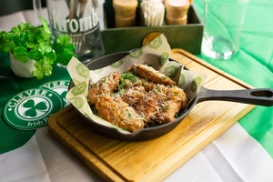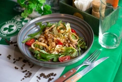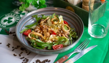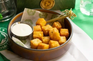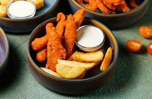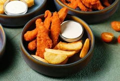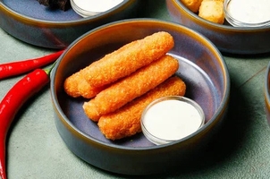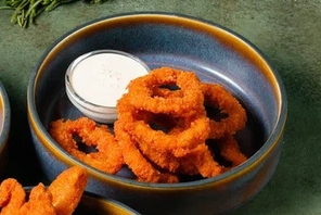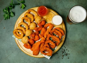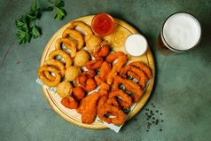креветки, треска, моцарелла, кольца кальмара, луковые кольца