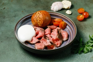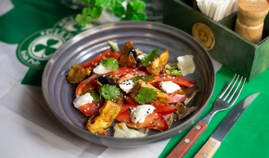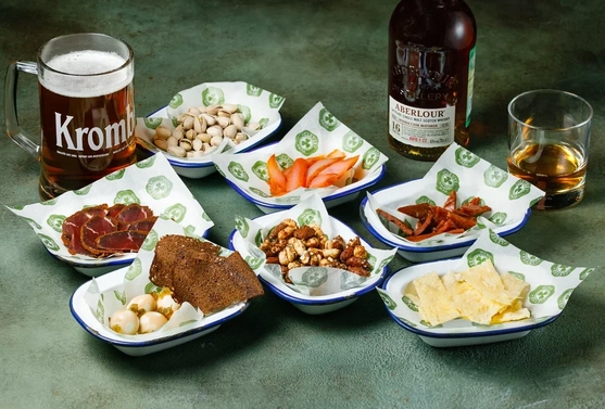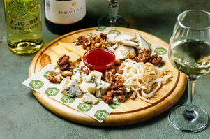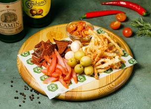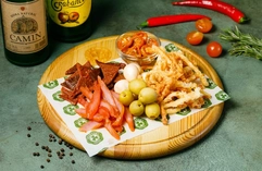 мясные чипсы, карпаччо из курицы, вяленные томаты, оливки, маринованные яйца, жареный сыр